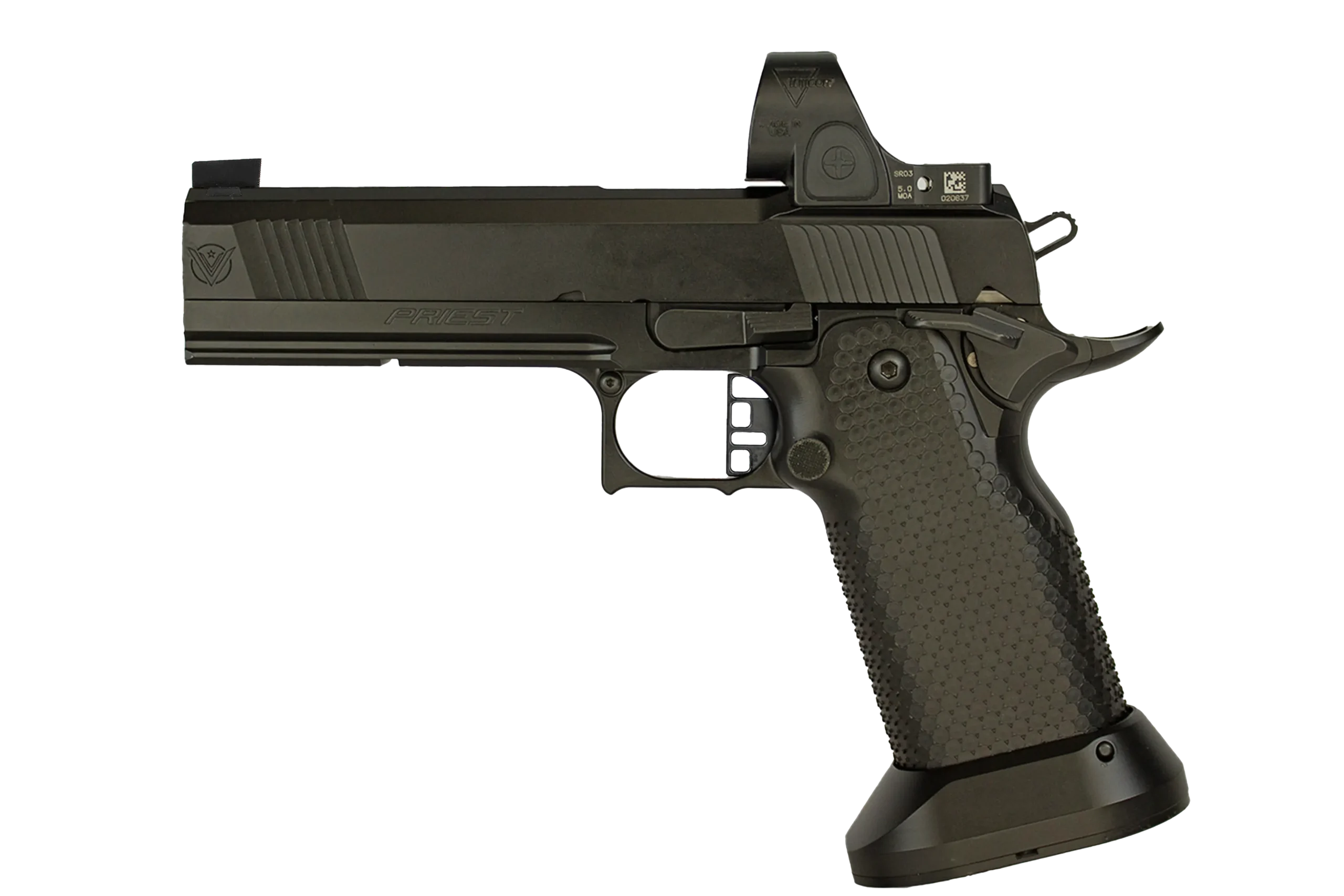 Unleash the ultimate edge with the Vudoo Priest 5” LDC Heavy. Built for unbeatable performance, this pistol features a full-length dust cover, co-witness sights, aggressively textured stainless steel grip, and extra large magwell, delivering superior balance and accuracy with every shot. The added weight of the stainless steel grip assists with recoil absorption. Built with an unmatched premium fit and finish, the Priest 5″ LDC Heavy sets the standard in double-stack 1911s. With a contour-matching RMR footprint with co-witness sights, competition blended safety, flush-cut barrel, and toolless guide rod for ease of takedown, this powerhouse is ready to elevate your performance to the next level. The Priest 5″ LDC Heavy is compatible with STI/SVI family of magazines giving users 22 round capacity and ships with two magazines.