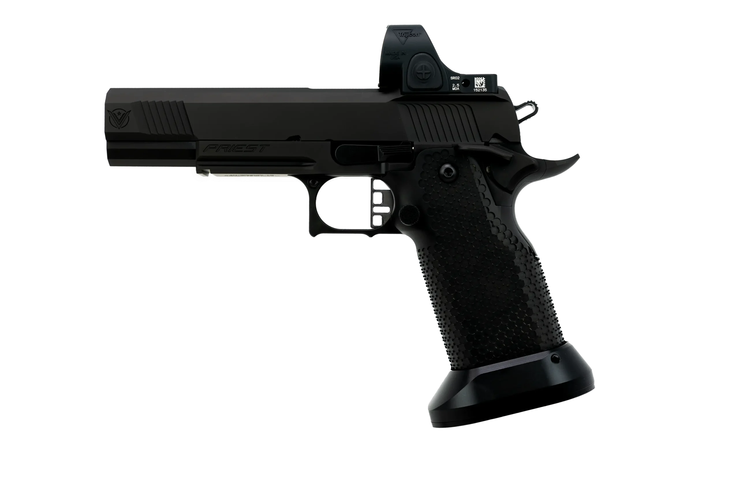 Unleash the ultimate edge with the Vudoo Priest 5” SDC Heavy. Built for unbeatable performance, this pistol features a standard-length dust cover, aggressively textured stainless steel grip, and extra large magwell, delivering superior balance and accuracy with every shot. The added weight of the stainless steel grip assists with recoil absorption. Built with an unmatched premium fit and finish, the Priest 5″ SDC Heavy sets the standard in double-stack 1911s. With a contour-matching RMR footprint, competition blended safety, flush-cut barrel, and toolless guide rod for ease of takedown, this powerhouse is ready to elevate your performance to the next level. The Priest 5″ SDC Heavy is compatible with STI/SVI family of magazines giving users 22 round capacity and ships with two magazines.