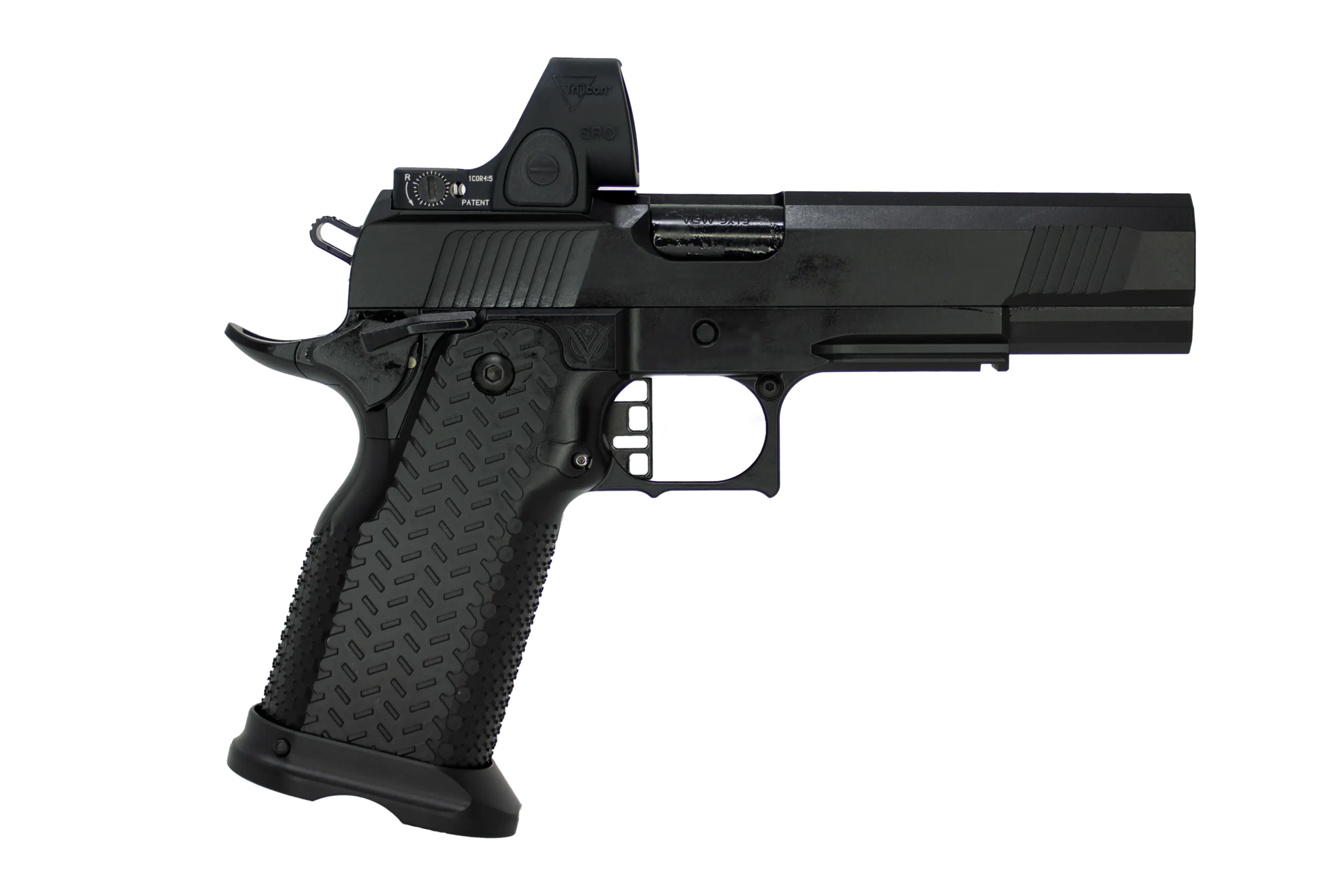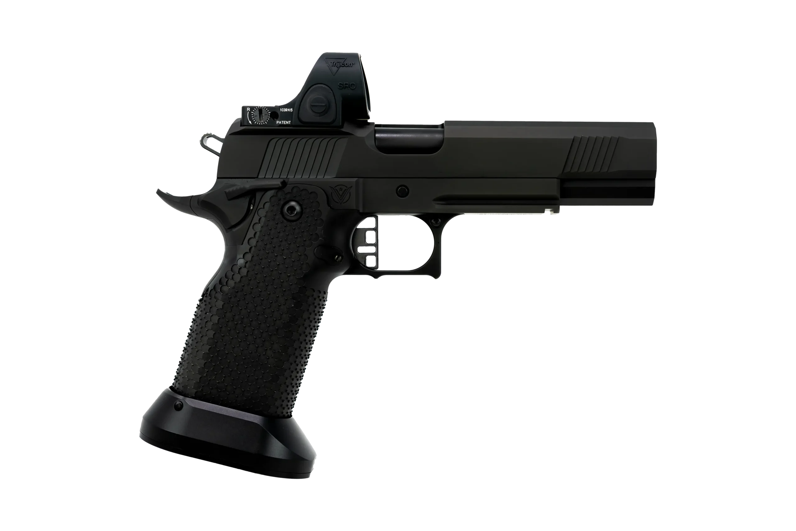 Staying true to our rimfire roots, the target .22lr is of the highest standard. This pistol will shoot Sub 1 inch at 50 yards with match ammo, or it doesnt ship. The target .22lr has its own, proprietary adjustable sights, slide mounted optic ready pic rail and ships with two magazines.